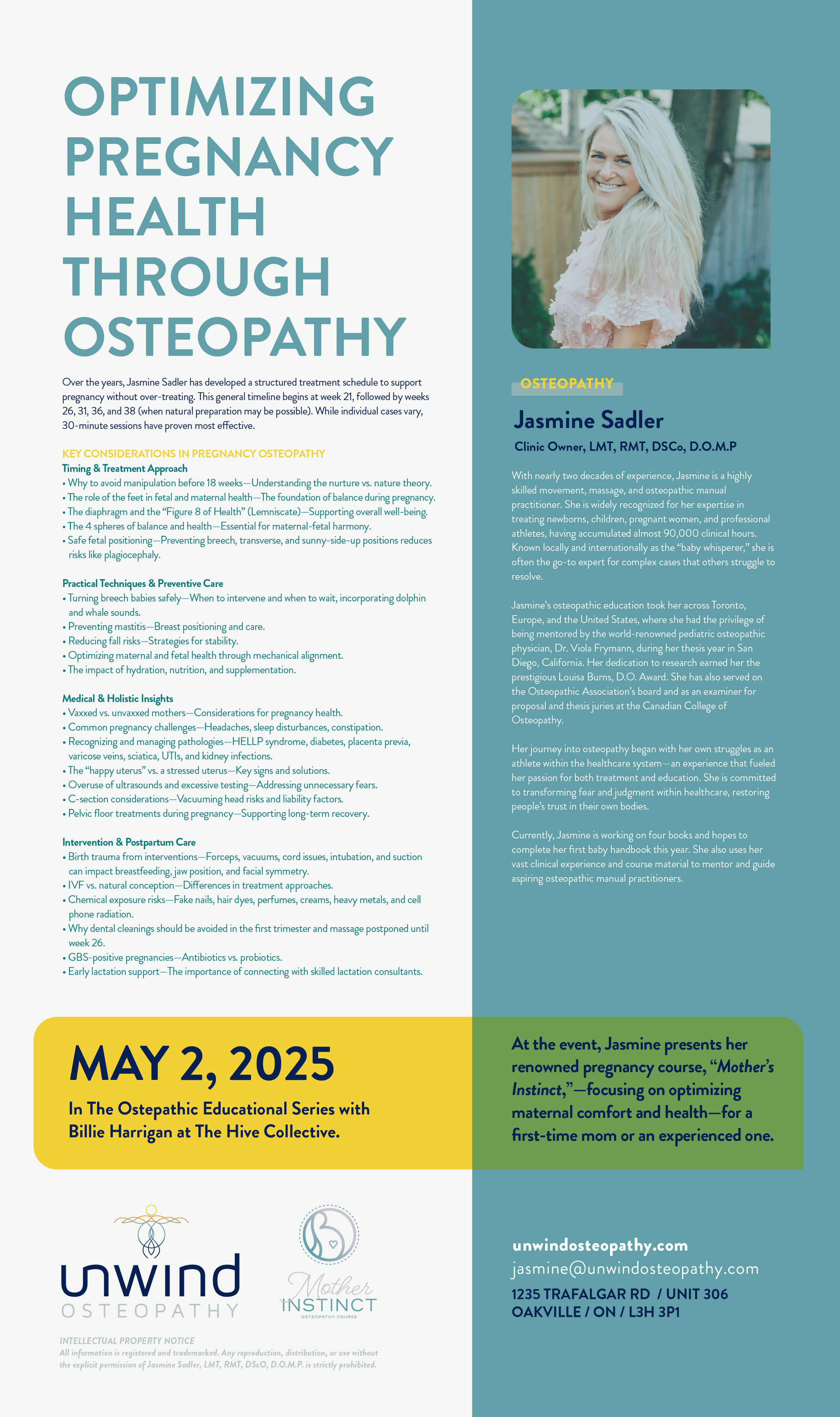 We are a private, highly specialized results-oriented Osteopathy clinic in Oakville, Ontario Canada. Owner and CEO Jasmine Sadler is the primary Reg. LMT, RMT, and Osteopathic Manual Practitioner. Jasmine has over 90,000 clinical hands-on experience combined with razer sharp assessment skills on mechanical and movement dysfunction over the past 20 years. Jasmine prides herself on honesty, results and her ability to understand when to treat and when to refer out, she is always grateful to have the trust of many.